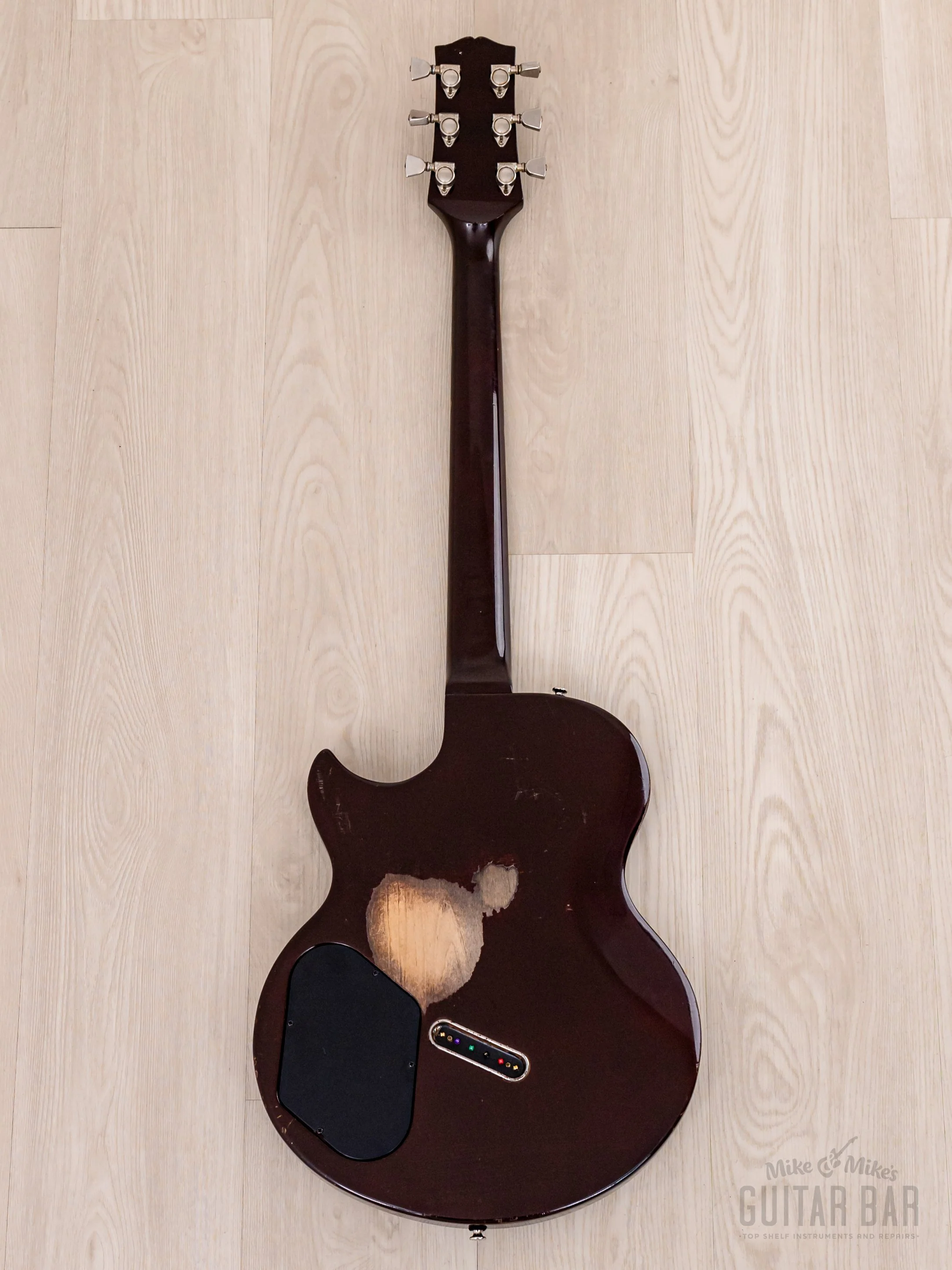 Up for sale, a 1976 Gibson L6-S Deluxe in 100% original condition and in perfect working order, complete with the original hardshell case. The L6-S models are often credited as some of the most underrated solidbody guitars in Gibsonās history, and were the very first collaboration between Gibson and Bill Lawrence, who designed the ātarbackā ceramic magnet Superhumbucker pickups used in these models. The body closely resembles a wider, thinner Les Paul, with a more generous Florentine cutaway, and this particular iteration is an L6-S Deluxe, boasting streamlined controls, string-through construction, and unique pentagonal pickup rings.Featuring a maple body and neck capped with a 24-fret rosewood fretboard, the natural acoustic tone is cutting and punchy. The pair of "Tarback" Superhumbuckers feature ceramic magnet construction, coupled with the black epoxy that gave these pickups their name (and ensures great control over feedback with high gain by suppressing microphonics). Particularly potent with surprising twang and clarity at the bridge, the neck pickup in contrast has ample warmth and bass register kick. Lightweight at 6lbs 12oz, this L6-S Deluxe has been professionally setup here at Mike & Mikeās Guitar Bar with 10-46 strings, low action, and accurate intonation.Neck Specs:-Wood: Maple-Shape: Slender C, measuring .800ā 1st fret, .950ā 12th fret-Fretboard: Rosewood, 24-fret, dot inlay-Frets: Medium jumbo (wide/flat), faint wear beneath the plain strings on frets 1-5-Scale Length: 24 3/4ā-Nut: 1 9/16ā-Tuners: Grover Rotomatic (tulip button, nickel-plated)-Serialization: Seven-digit stamp on pegheadBody Specs:-Wood: Maple-Pickups: Superhumbucker āTarbackā x2 (Bill Lawrence-designed)-Controls: Volume, Tone, Three-way pickup selector-Harness: Untouched solder, CTS pots date to 40th week of 1976-Hardware: Harmonica bridge-Plastics: One-ply pickguard, pentagonal pickup surrounds, black speed knobsThe Wine Red nitro lacquer finish shows buckle rash on the back and lighter wear through the gloss where the forearm crosses the top, with tight horizontal lacquer checking and some minor dings on the body as a whole. A different bridge was previously fitted, with the original bridge and threaded body inserts reinstalled. The nitro gloss on the neck profile exhibits light palm wear down to the bare maple on the shoulders.The original Gibson black tolex hardshell case is included. The case has the Gibson silkscreen on the lid and functional latches. A handle is not installed, but both handle mounts are present.