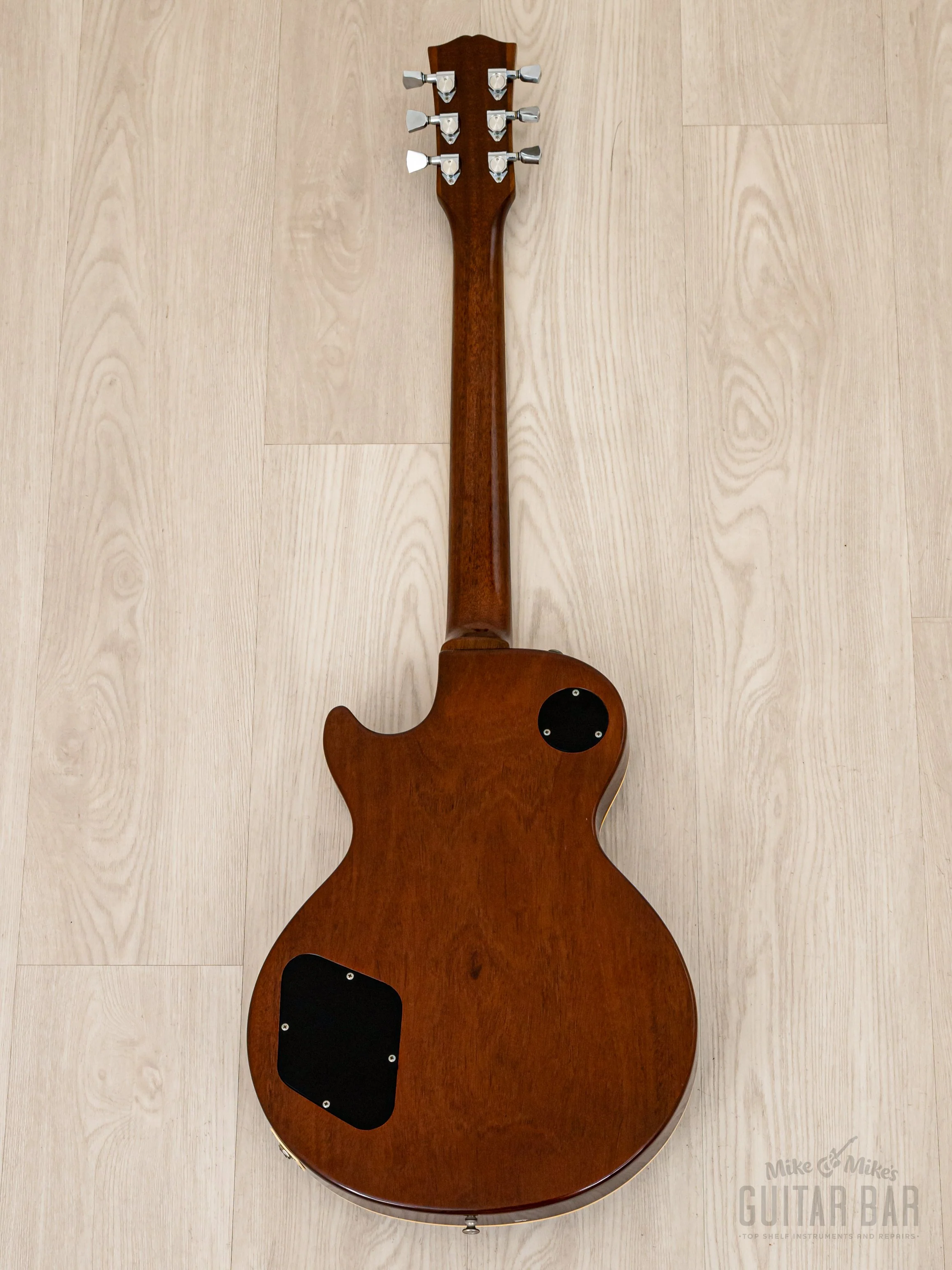 The gloss “Brown Sunburst” exhibits light buckle rash central to the back, a couple small scuffs and dings along the lower bout perimeter, and a scant few additional faint marks on the body as a whole. The smooth gloss on the neck profile is flawless save for one tiny nick central to the carve behind fret 9, virtually undetectable to the palm.