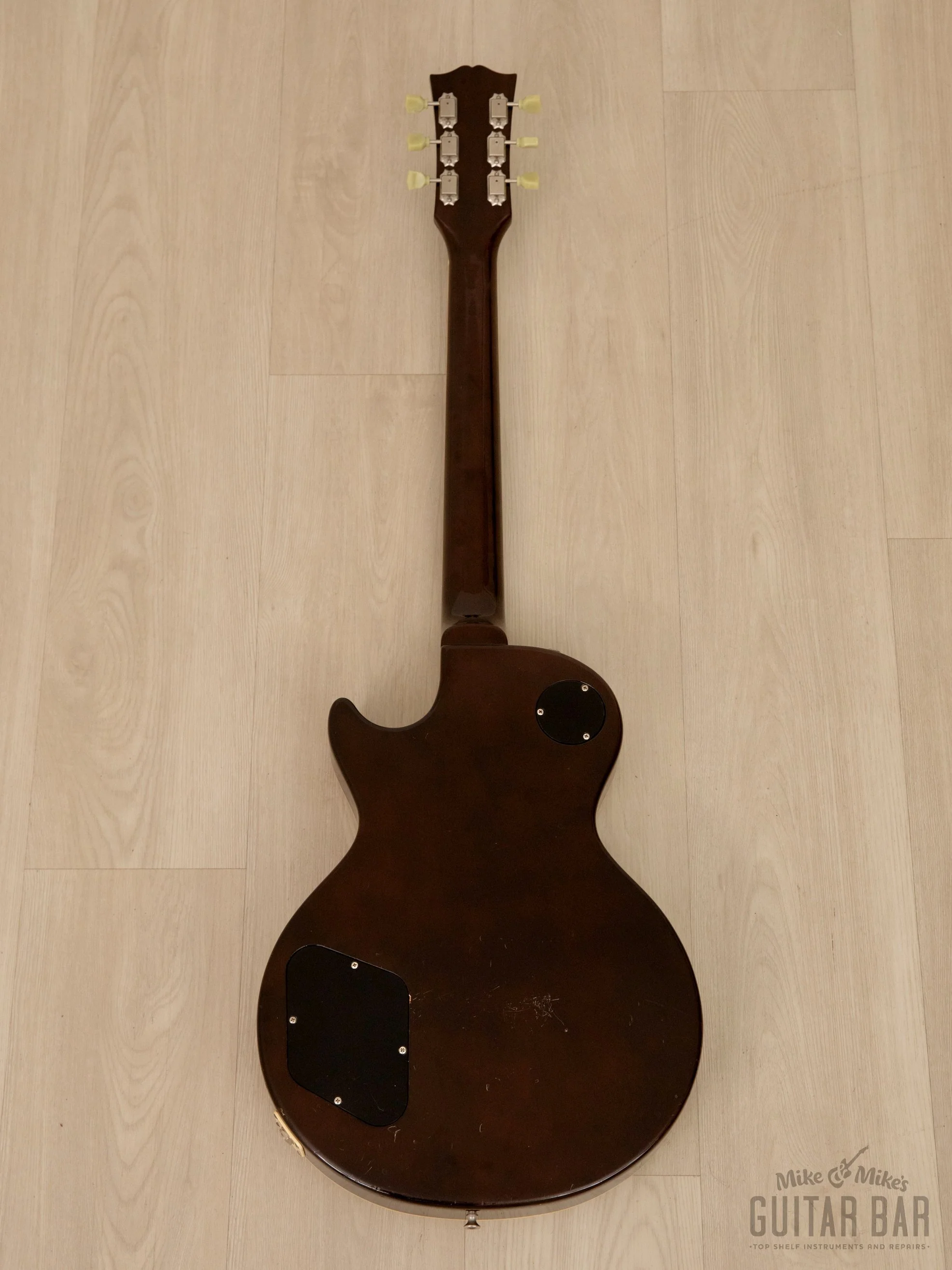 Up for sale, a 1979 Tokai LS-50 Les Paul Reborn complete with the original Lifton-style hardshell case and loaded with a pair of Gibson 61 Burstbucker PAFs. Widely considered to be among the finest Japanese ālawsuitā Les Paul iterations, this is an extremely early example, introduced in 1978 as an exceedingly faithful iteration of the LP platform. In 1980, the headstock nomenclature was quickly changed to Reborn Old to avoid any further legal implications from Gibson, and shortly thereafter to its current name, Love Rock.The classic tonewood complement of a mahogany body, maple top, mahogany neck, and bound rosewood fretboard yields a resonant, lively acoustic response with plenty of natural sustain; an ideal platform for the upgraded ā61 Burstbucker PAF humbuckers. Described by Gibson as āa classic voice with added power and top end,ā these Alnico V humbuckers are big and bold, with authoritative, sparkling trebles, bold lows, and tailored mids for optimal clarity in all pickup positions. Lightweight at just 8lbs 2oz, this LS-50 has been professionally setup here at Mike & Mikeās Guitar Bar with 10-46 strings, low action, and accurate intonation.The mahogany neck has a substantial "50s-style" C-shaped profile carve with full shoulders and ideal heft, measuring .885ā deep at the 1st fret and .985ā at the 12th. The bound rosewood fretboard features pearloid trapezoid inlay, and the medium jumbo fretwire benefits from a level and crown, exhibiting no wear. This guitar plays cleanly up the 24 3/4ā scale with a straight neck and a responsive, optimally-adjusted truss rod, and the replacement nut measures 1 11/16ā in width. The headstock has Tokai's very early and quickly abandoned āLes Paul Rebornā script, and a substituted set of Kluson-style tuning machines turn smoothly and hold accurate pitch, with lightly greened keystone buttons.All of the electronics function as intended, and the original circuit board wiring harness has been swapped for a more traditional harness with full-size pots and green chiclet tone caps. Plastics comprise the cream pickguard, amber switch tip, and quartet of gold bonnet knobs. The no-wire ABR-1-style bridge still has plenty of shine, while the stopbar tailpiece has lost much of its plating.Cosmetic wear on the gloss Goldtop finish includes buckle rash on the back and a number of dings, largely limited to the back and body perimeter. The top, by comparison, presents cleanly. The neck profile retains its smooth gloss, with a scant few shallow marks along the profile length that have no impact on playability.The original Tokai-branded Lifton-style brown hardshell case is included.