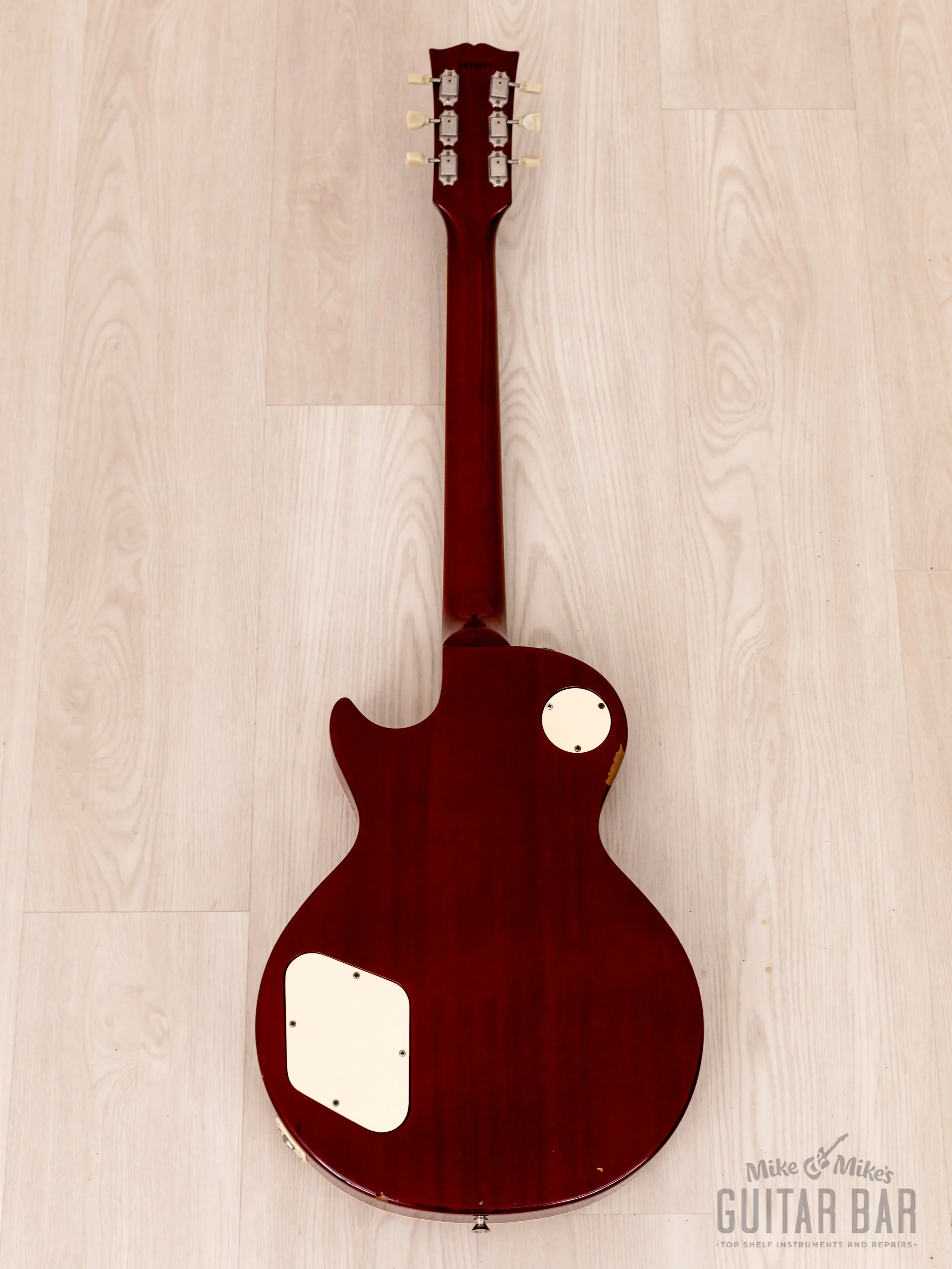 The gloss Cherry Sunburst finish highlights the deep, dimensional and highly consistent figuring across the two-piece quilted maple top. There is very faint speckling in the clear coat on the top (likely a reaction to Japanās humid climate), along with buckle rash at the bass-side upper bout on the back, through to the mahogany along the edge, and a handful of other minor dings on the back and along the lower bout perimeter. The neck profile retains its smooth gloss, with a few shallow nicks along the profile length that have no impact on playability.