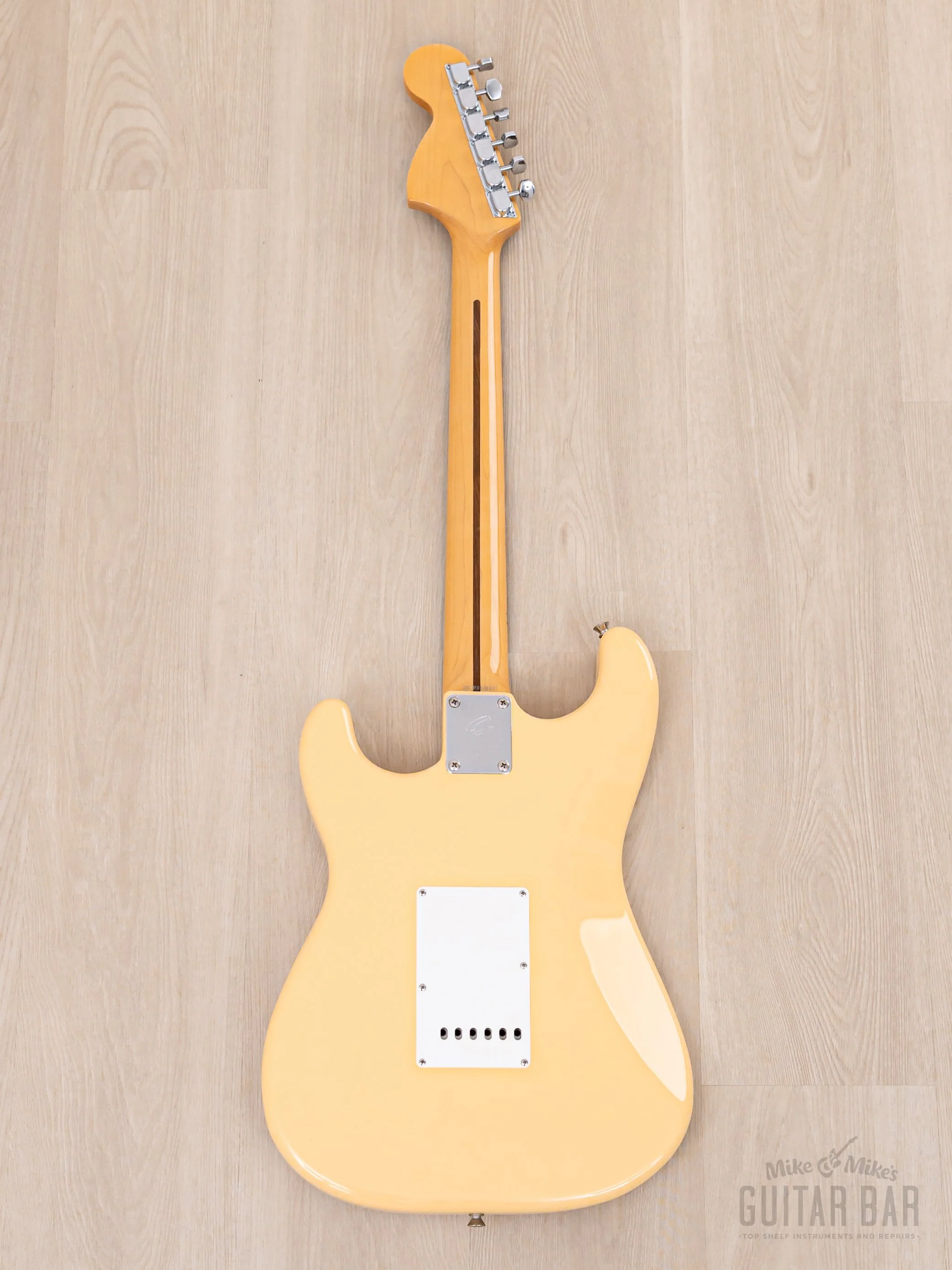 The gloss finish is abbreviated YWH (Yellow White), as it's a purposefully yellowed iteration of Olympic White that closely matches Yngwie's vintage Strats. This is a clean example, with just a couple tiny nicks on the body as a whole. The smooth gloss on the neck profile is flawless.