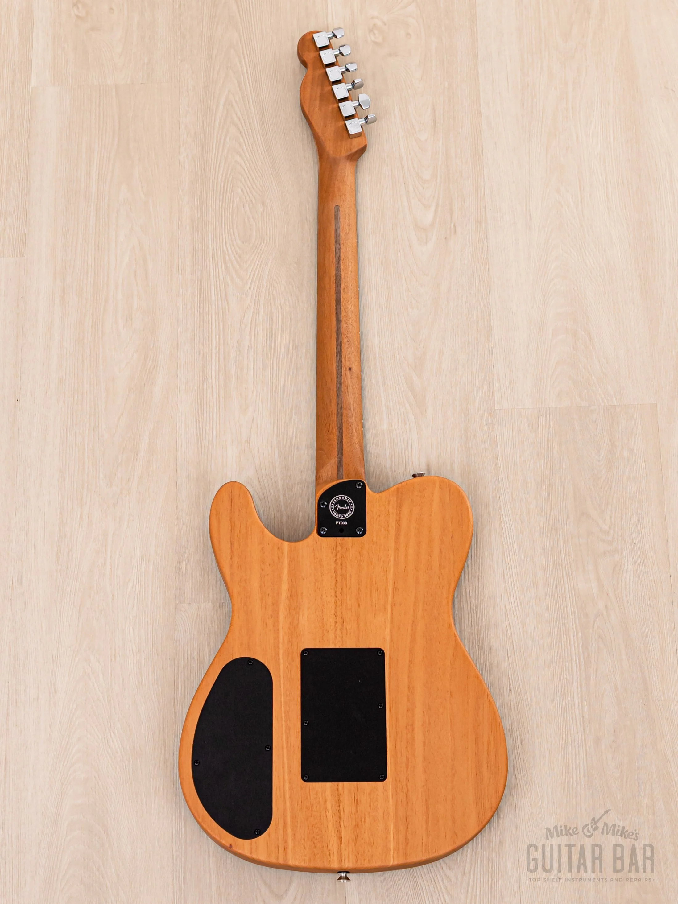 Tonewoods include a mahogany body, mahogany neck, and 22-fret slab ebony fingerboard; the American Acoustasonics feature Fenderâs patented Stringed Instrument Resonance System technology, carefully calibrated with a âwaterfallâ design to guide airflow in and out of the hollow body to ensure fantastic resonance and enhanced tones both acoustically and plugged in. There are a wide range of sounds on tap via the trio of pickups, including a Fishman Undersaddle Transducer, Fishman Acoustasonic Enhancer, and Fender Acoustasonic Noiseless single coil. The Acoustasonic Noiseless (as the name suggests) is designed for hum-free performance, yielding quintessential Fender sparkle and snap, and the pickup can be played solo or blended with the piezo undersaddle transducer for a wide array of naturally brassy, warm and punchy tones. The Acoustasonic Enhancer registers the vibrations of the top, adding an extra percussive kick, also blendable with the transducer. This Tokyo Flagship Limited Edition American Acousticasonic is featherweight at 4lbs 13oz, professionally setup here at Mike & Mikeâs Guitar Bar with 12-53 bronze strings and low action.