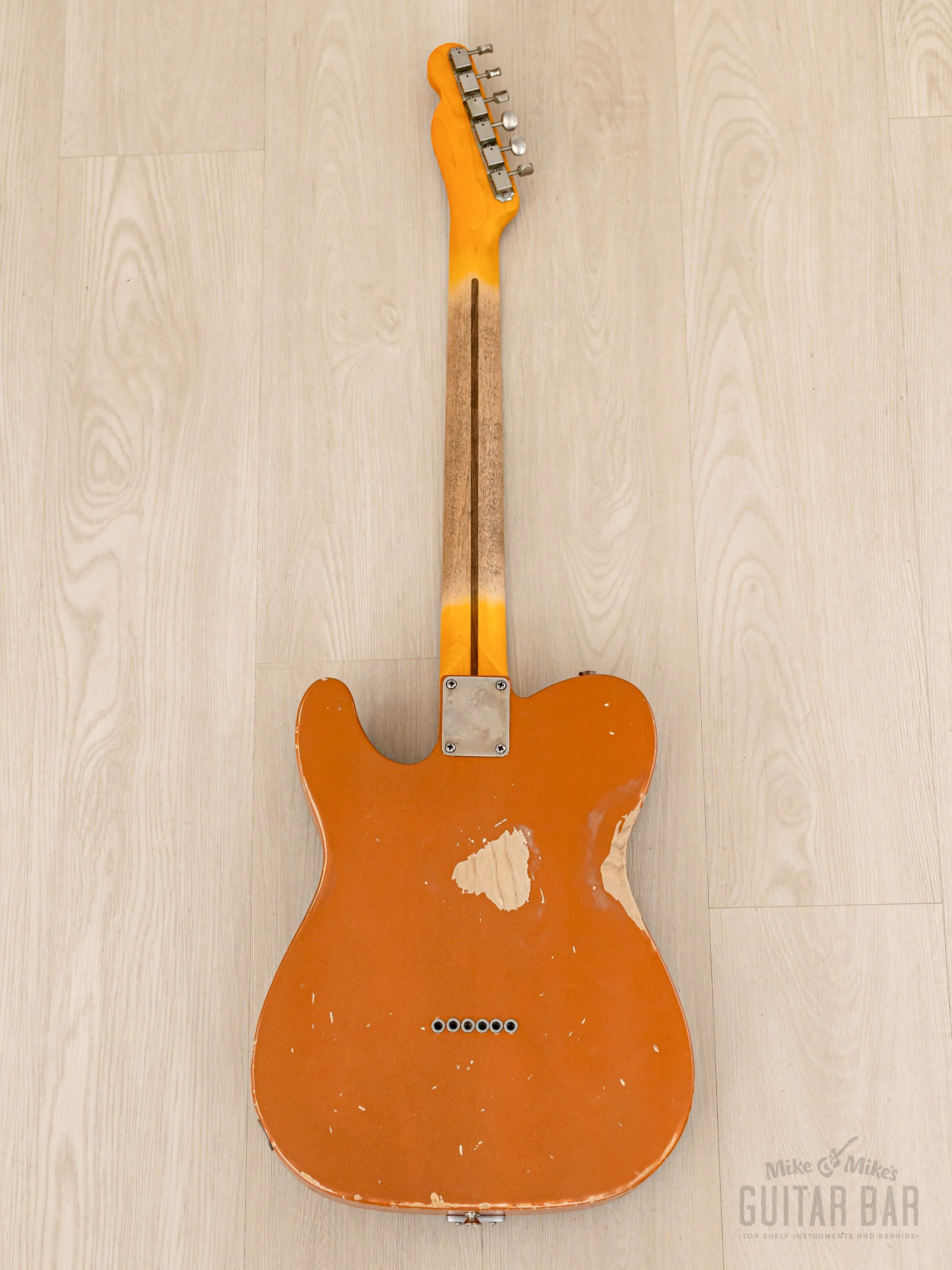 The Copper nitro lacquer finish and relic was executed by MJT (who also supplied the body), and the lacquer is shot nice and thin for maximal resonance. MJT's relic treatment includes subtle checking, simulated forearm arm and buckle wear, and various small marks. Beyond the relic, thereās virtually no playwear. The Allparts TMVF-C neck is finished with a thin layer of nitro, also treated with a factory aging process that effectively strips most of the finish (replicating extensive palm wear) for a flawless open-grain, satin feel.